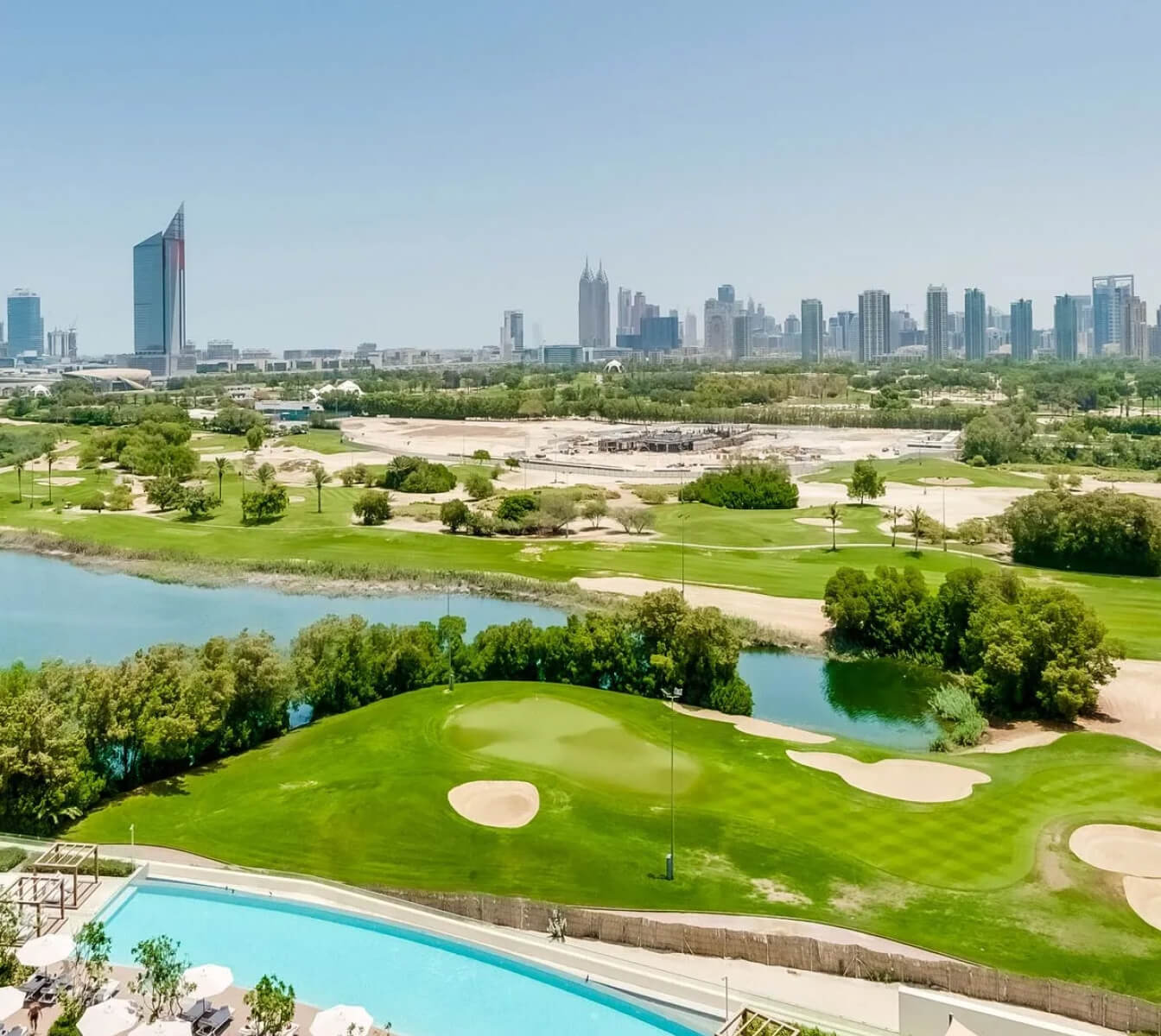 High-end properties in Emirates Hills overlook Montgomerie Golf Club Dubai. The area is famous for its green spaces, parks, perfect lawns, and artificial ponds – it is one of the most “natural” locations in the heart of Dubai. It also features several elite schools and kindergartens. The Meadows Village Center is about a 13-minute walk away. Dubai Marina and Palm Jumeirah are no more than 4 km away. It will take half an hour to get to Dubai Airport and 25 minutes to reach the Burj Khalifa and Dubai Mall.