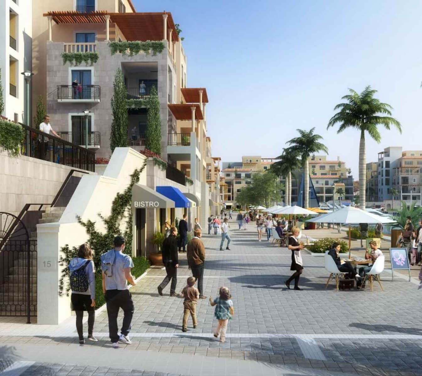 The neighborhood features a mix of one to four bedroom apartments in mid-rise buildings. Drawing inspiration from Mediterranean architecture, the design creates a welcoming atmosphere that captures the charm of coastal European neighborhoods.