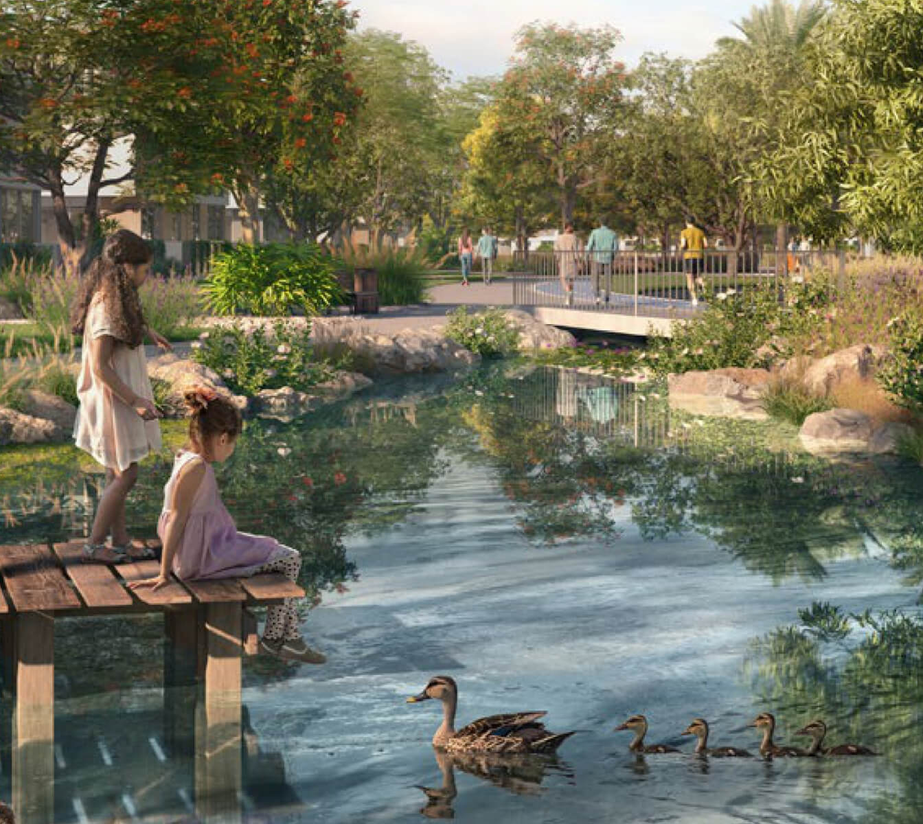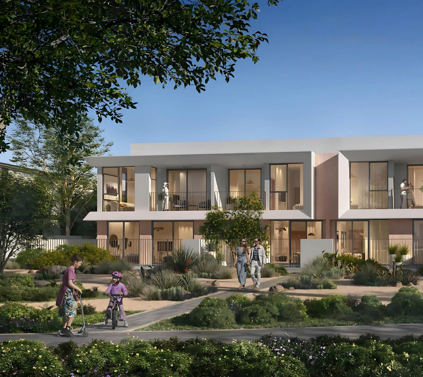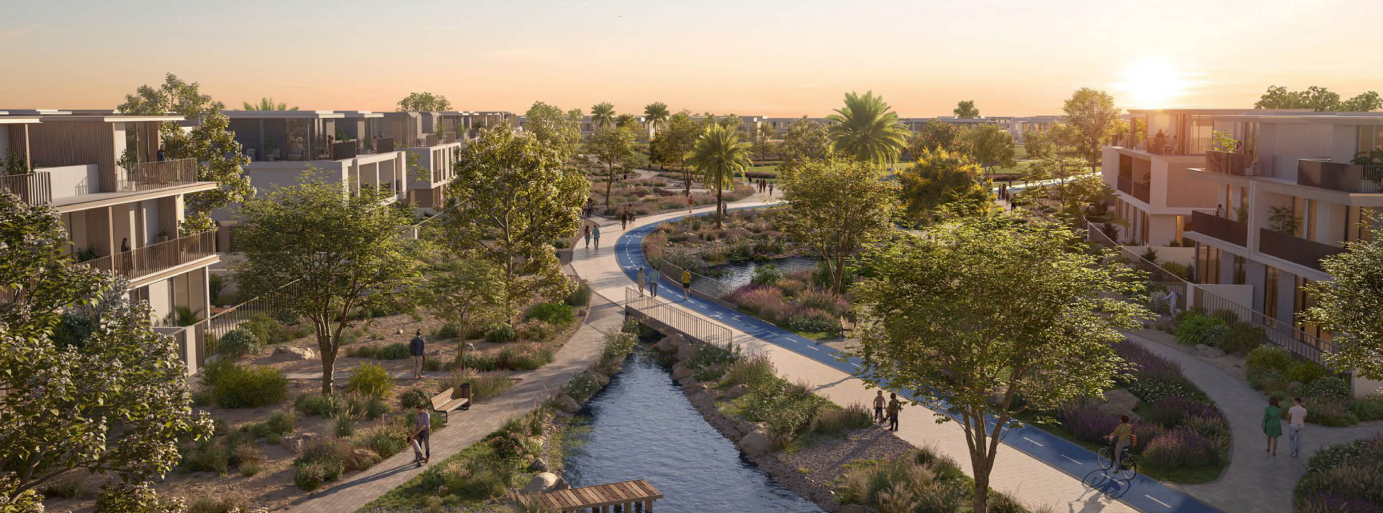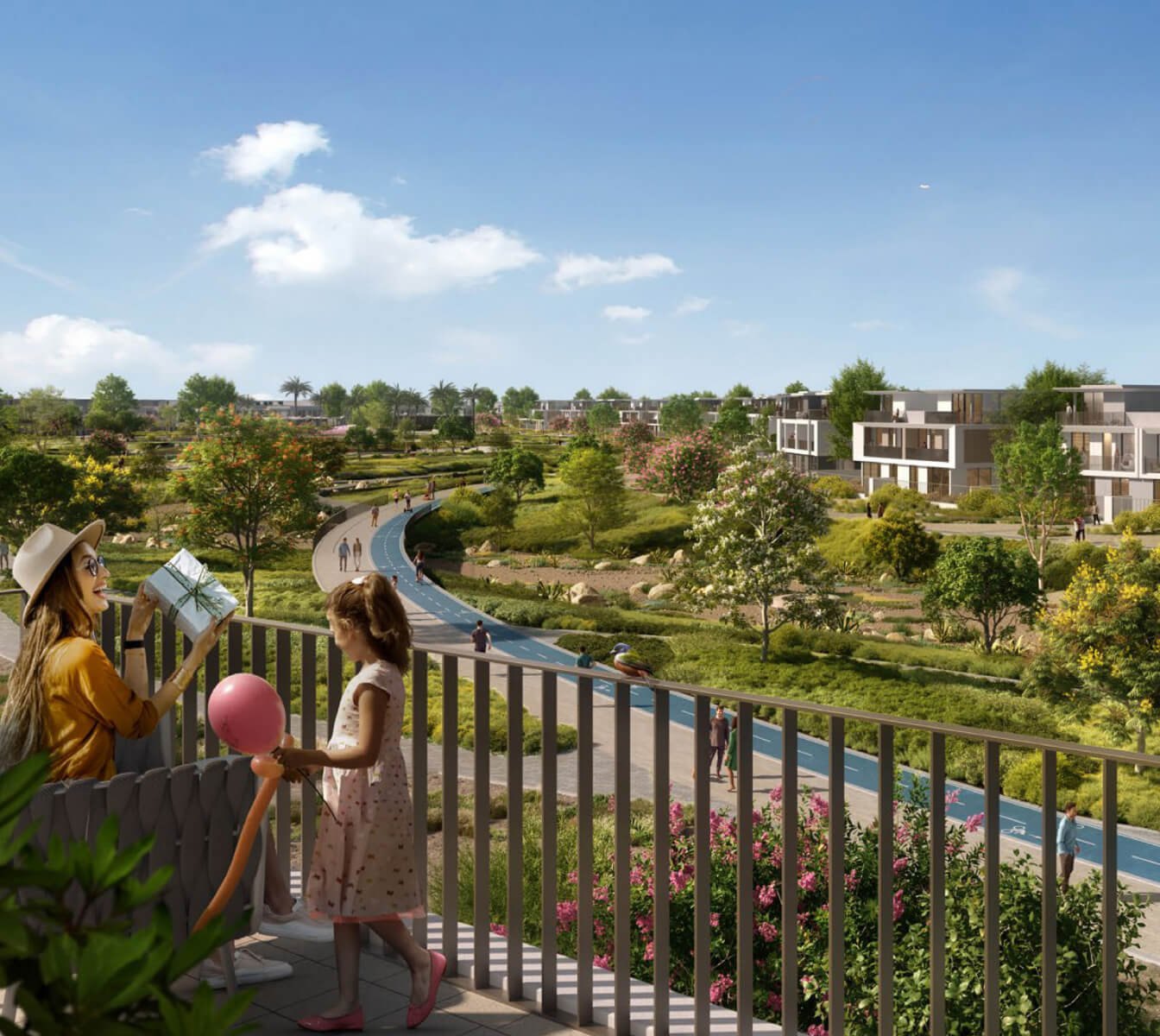 The Emaar Properties project includes parks, sports facilities, walking areas, flower farms, an amphitheater, and children’s playgrounds. There is all you need to feel in harmony with nature. The community already has access to the E77 and E66 highways – the road to the Burj Khalifa and Business Bay will take no more than 35 minutes. The construction of a metro station will come to an end by 2029. Within reach are Dubai’s most iconic landmarks, including The Sevens Stadium, IMG Worlds of Adventure, Dubai Outlet Mall, Sahara Desert Fortress, and Global Village.