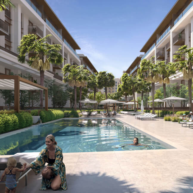 Jomana is a residential complex developed by Meraas, situated in Madinat Jumeirah Living, just 5 minutes from the beachfront. The complex offers 1-4 bedroom apartments for sale. With spacious green landscapes, play areas, and nearby daycare centers and schools within walking distance, it is perfect for families. Residents can also enjoy a swimming pool, fitness center, community center, BBQ area, and other amenities designed for their comfort.