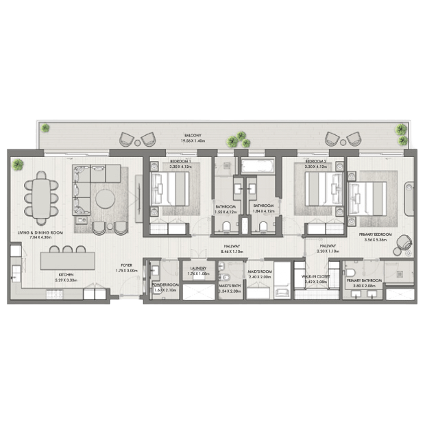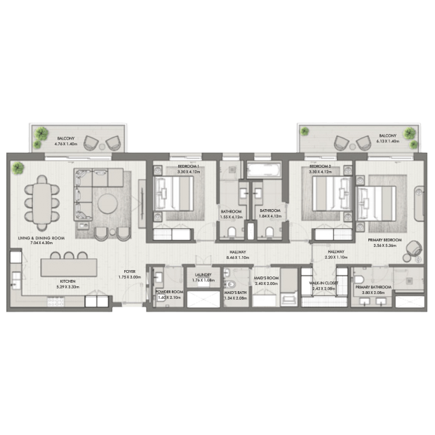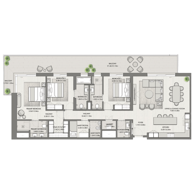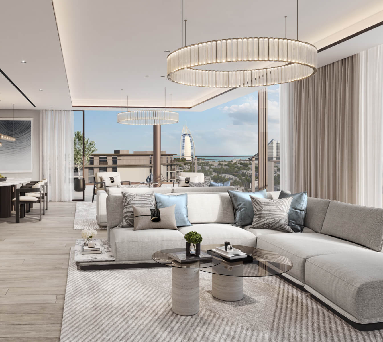 MJL-Riwa, a project by Meraas, offers real estate for sale with stunning views of the Burj Al Arab in the Madinat Jumeirah area. Apartments with one, two, and three bedrooms, as well as penthouses with four bedrooms, are available for purchase. The size of the apartments ranges from 67 square meters to 407 square meters. The interiors are designed in calm gray and beige colors, using natural materials. The panoramic windows and balconies provide breathtaking views of green promenades, the sea, and sunsets. Prices for MJL-Riwa properties start at 2.35 million AED. The project is scheduled to be completed in the third quarter of 2027.
