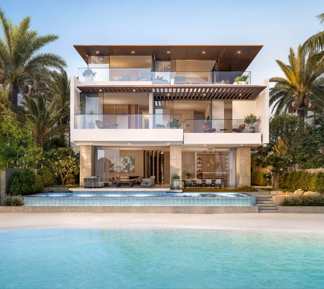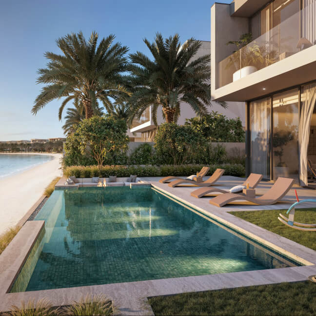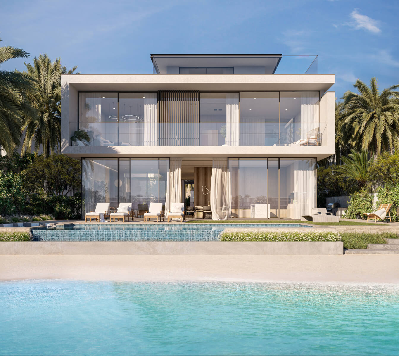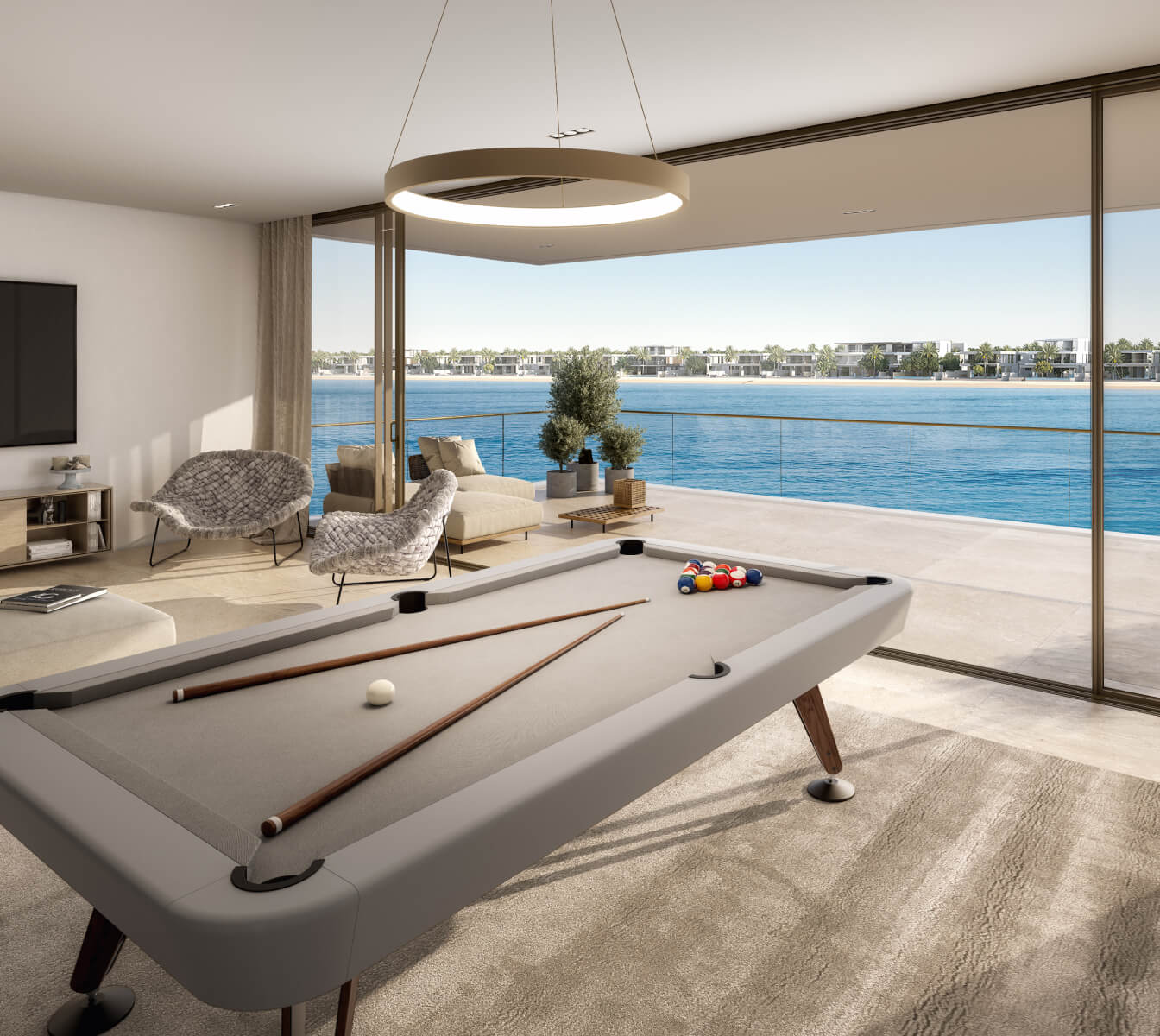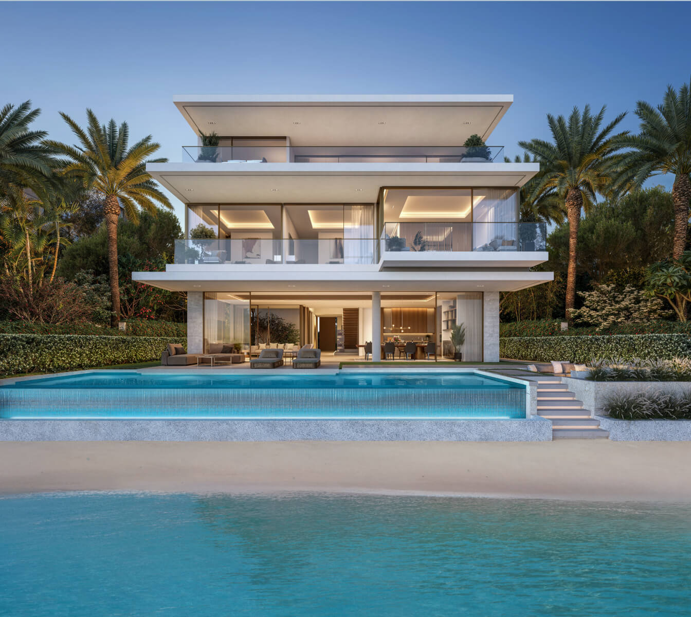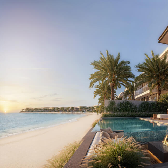Palm Jebel Ali offers 10 different types of villas for purchase on Frond С. Each with its own unique style: Blue Horizon, Cobalt, Pacific Breeze, Cyan Sky, Indigo Ocean, Baia Luna, Ocean Whisper, Wave Crest, Bluejay, and Crystal Springs. Each villa has a private pool with a panoramic view, as well as access to a beach with snow-white sand. The villas have various features, including terraces, rooftop lounges, outdoor dining areas, laundry rooms, storage rooms, demonstration kitchens, staff rooms, driver's rooms, elevators, garages for two cars, two parking spaces on-site, and more. Some of the Frond C villas also have workrooms. The rich infrastructure of Palm Jebel Ali Island offers residents everything they need for a comfortable and vibrant lifestyle. Wide pedestrian roads, cozy parks, cycling and running tracks are available for residents to enjoy. The island has beach clubs, eco-resorts, yacht clubs, scenic parks, a medical center, a gym, restaurants, cafés, shopping centers, and other recreational areas. Palm Jebel Ali is connected to the mainland of Dubai by bridges. It takes approximately 10 to 20 minutes to reach Jebel Ali and the Canal District. Motiongate Dubai Park, Palm Jumeirah, and Al Maktoum International Airport are all located about 25 to 40 minutes away by car.