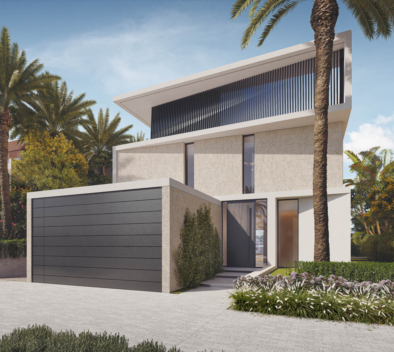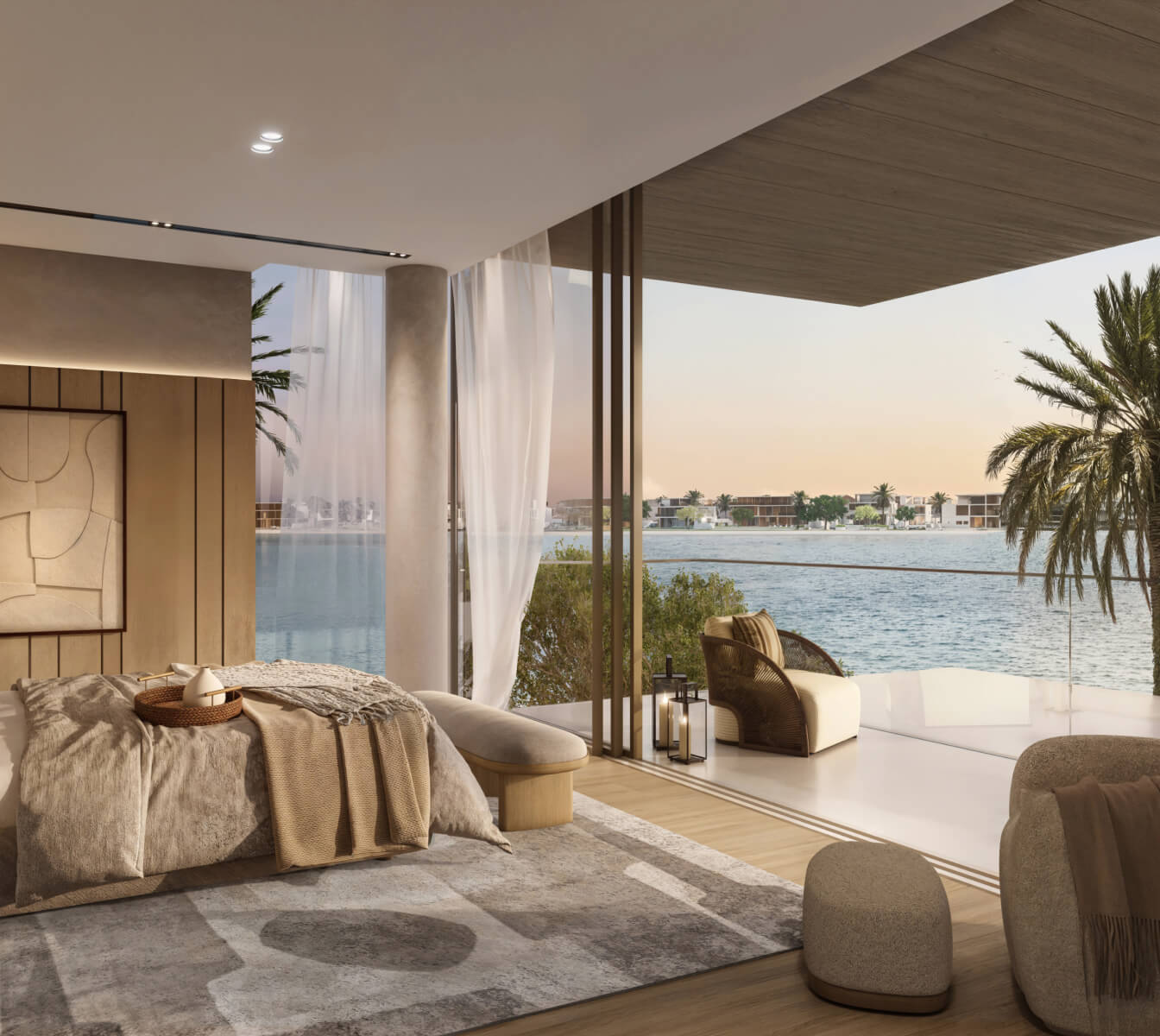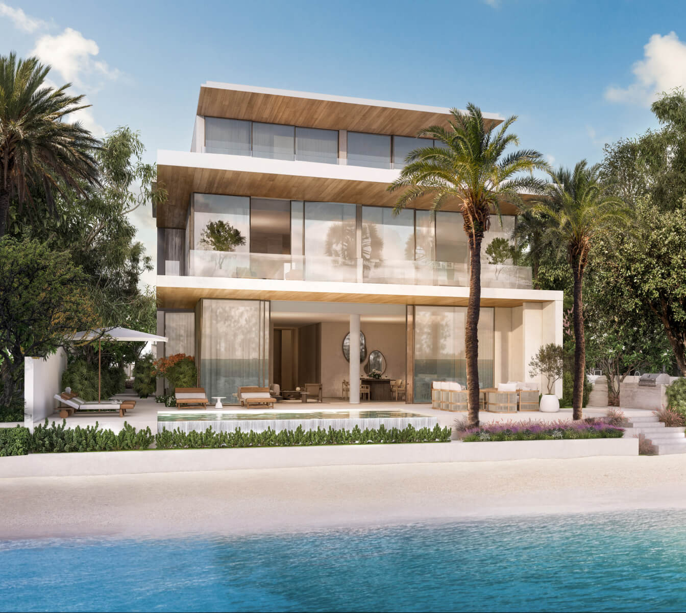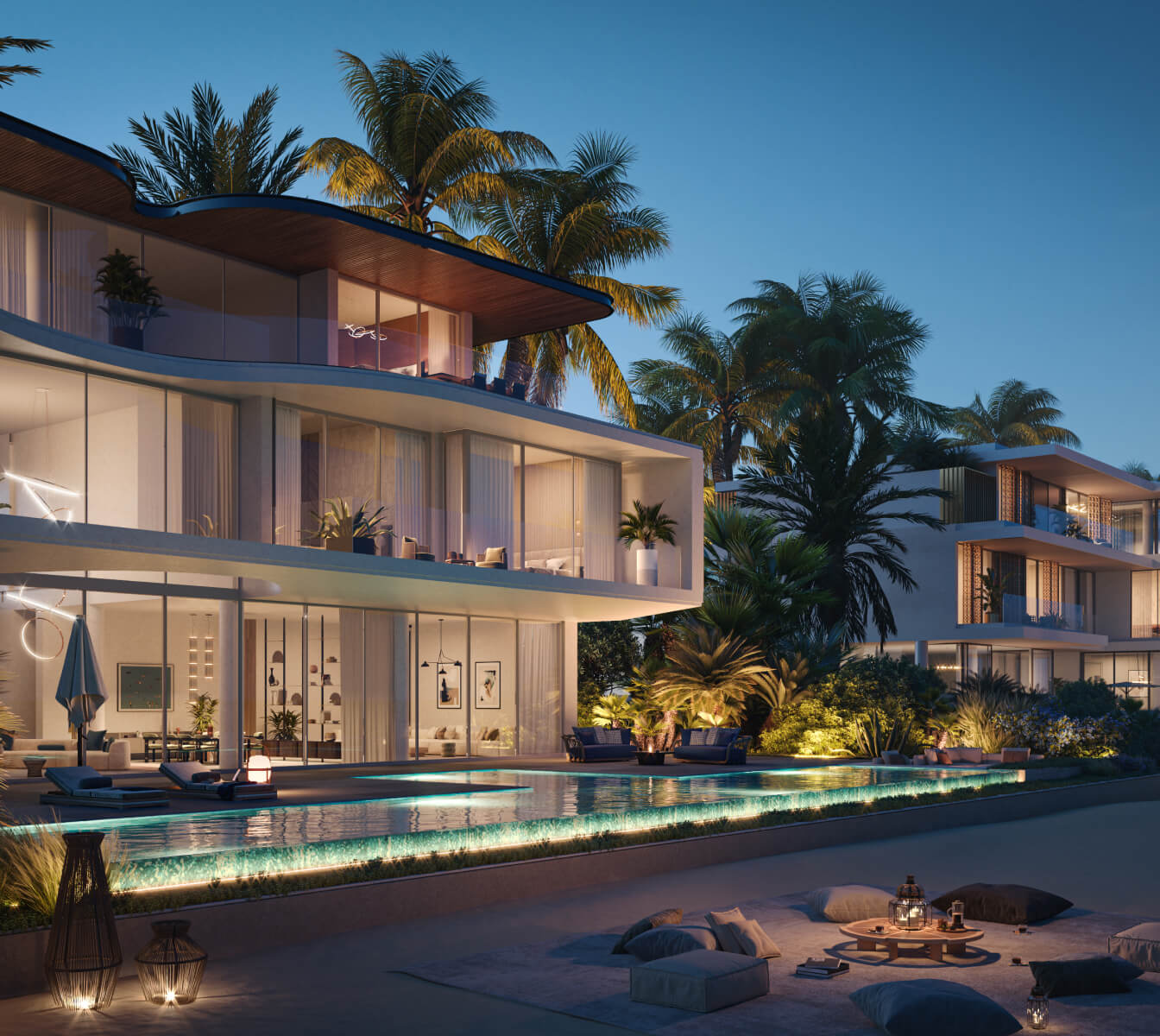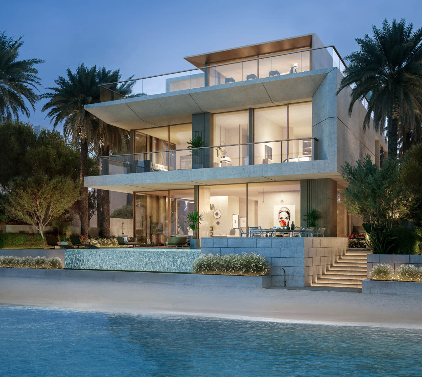 Palm Jebel Ali offers 10 different types of villas for purchase on Frond С. Each with its own unique style: Blue Horizon, Cobalt, Pacific Breeze, Cyan Sky, Indigo Ocean, Baia Luna, Ocean Whisper, Wave Crest, Bluejay, and Crystal Springs. Each villa has a private pool with a panoramic view, as well as access to a beach with snow-white sand. The villas have various features, including terraces, rooftop lounges, outdoor dining areas, laundry rooms, storage rooms, demonstration kitchens, staff rooms, driver's rooms, elevators, garages for two cars, two parking spaces on-site, and more. Some of the Frond C villas also have workrooms. The rich infrastructure of Palm Jebel Ali Island offers residents everything they need for a comfortable and vibrant lifestyle. Wide pedestrian roads, cozy parks, cycling and running tracks are available for residents to enjoy. The island has beach clubs, eco-resorts, yacht clubs, scenic parks, a medical center, a gym, restaurants, cafés, shopping centers, and other recreational areas. Palm Jebel Ali is connected to the mainland of Dubai by bridges. It takes approximately 10 to 20 minutes to reach Jebel Ali and the Canal District. Motiongate Dubai Park, Palm Jumeirah, and Al Maktoum International Airport are all located about 25 to 40 minutes away by car.
