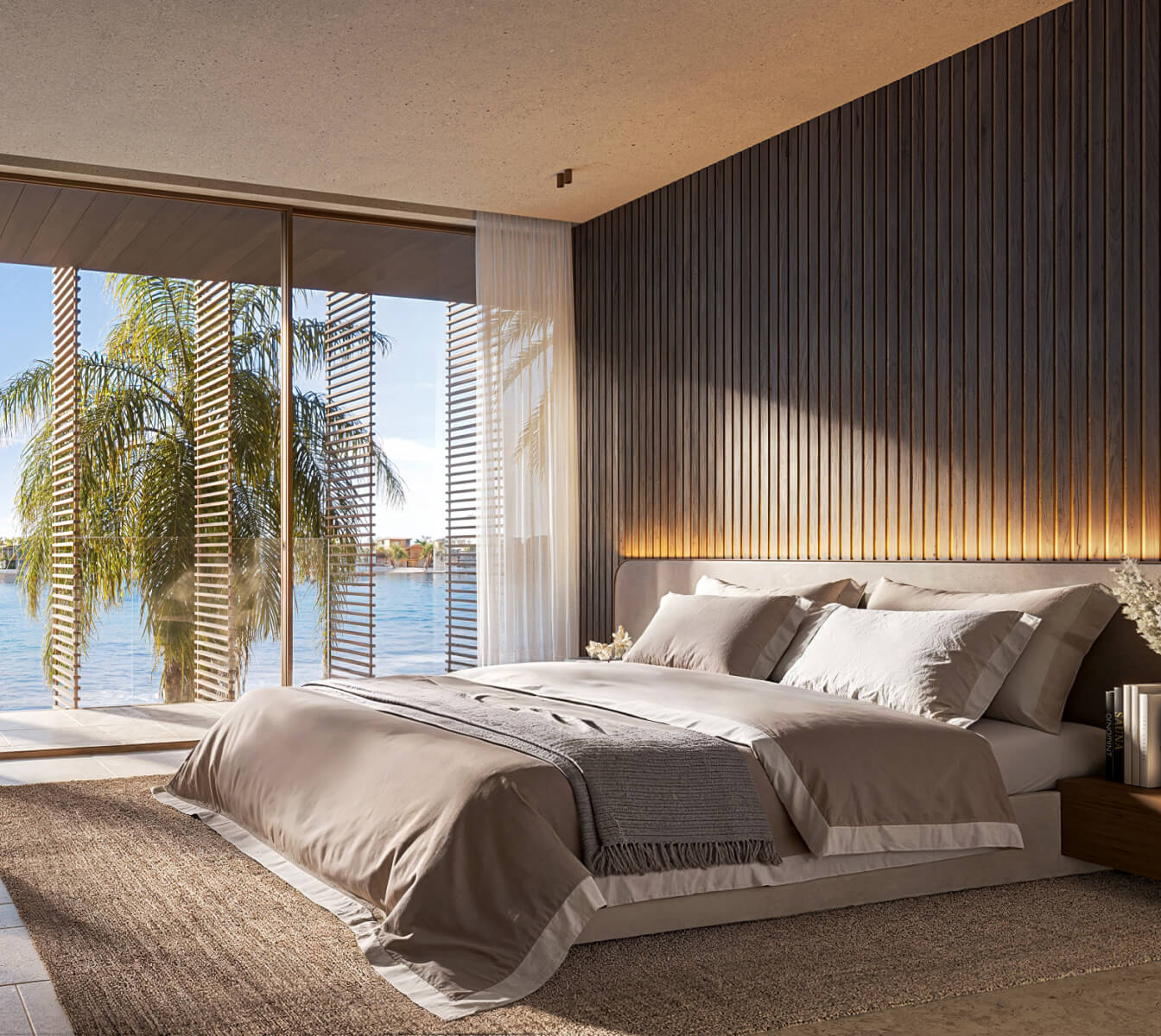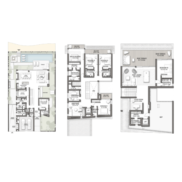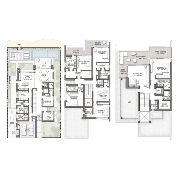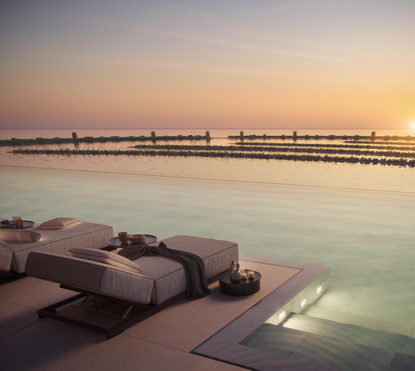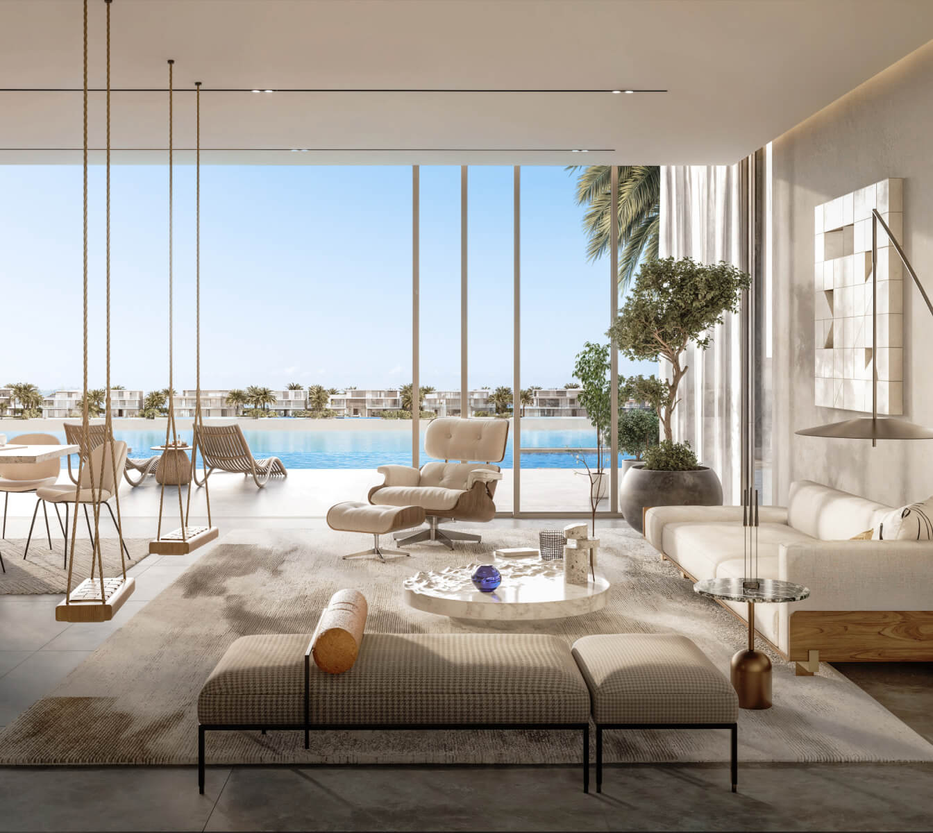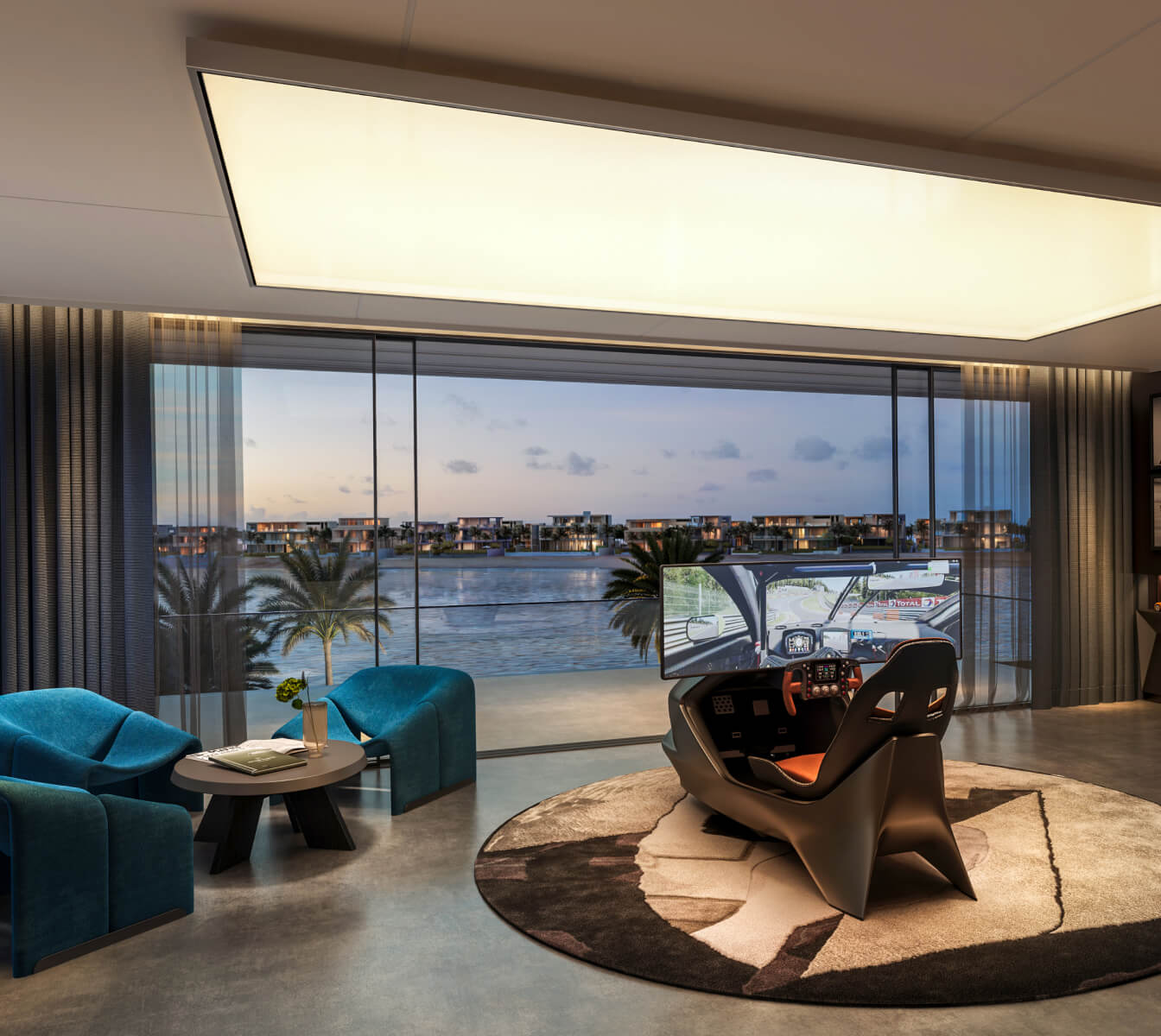 Palm Jebel Ali offers 10 different types of villas for purchase on Frond С. Each with its own unique style: Blue Horizon, Cobalt, Pacific Breeze, Cyan Sky, Indigo Ocean, Baia Luna, Ocean Whisper, Wave Crest, Bluejay, and Crystal Springs. Each villa has a private pool with a panoramic view, as well as access to a beach with snow-white sand. The villas have various features, including terraces, rooftop lounges, outdoor dining areas, laundry rooms, storage rooms, demonstration kitchens, staff rooms, driver's rooms, elevators, garages for two cars, two parking spaces on-site, and more. Some of the Frond C villas also have workrooms. The rich infrastructure of Palm Jebel Ali Island offers residents everything they need for a comfortable and vibrant lifestyle. Wide pedestrian roads, cozy parks, cycling and running tracks are available for residents to enjoy. The island has beach clubs, eco-resorts, yacht clubs, scenic parks, a medical center, a gym, restaurants, cafés, shopping centers, and other recreational areas. Palm Jebel Ali is connected to the mainland of Dubai by bridges. It takes approximately 10 to 20 minutes to reach Jebel Ali and the Canal District. Motiongate Dubai Park, Palm Jumeirah, and Al Maktoum International Airport are all located about 25 to 40 minutes away by car.