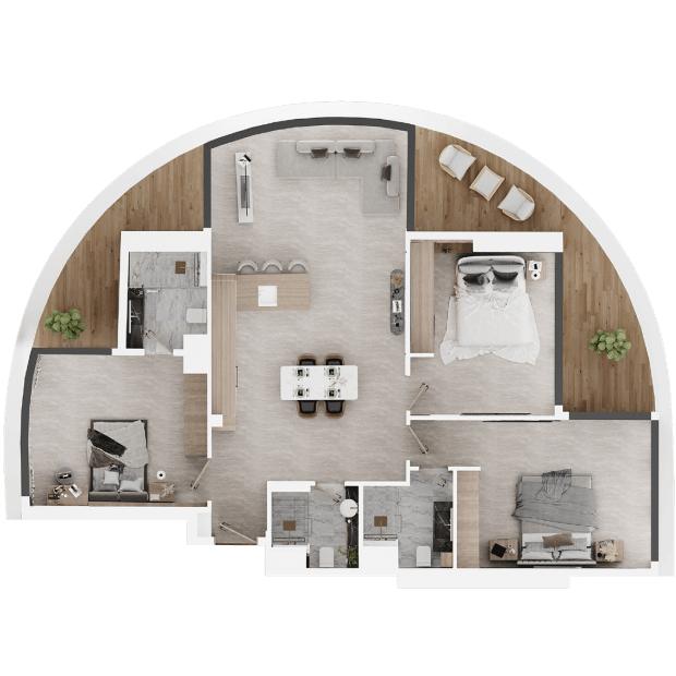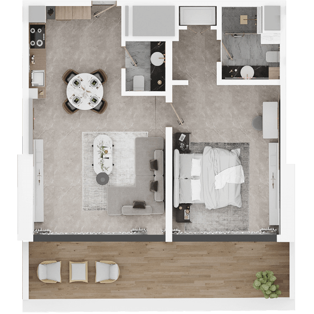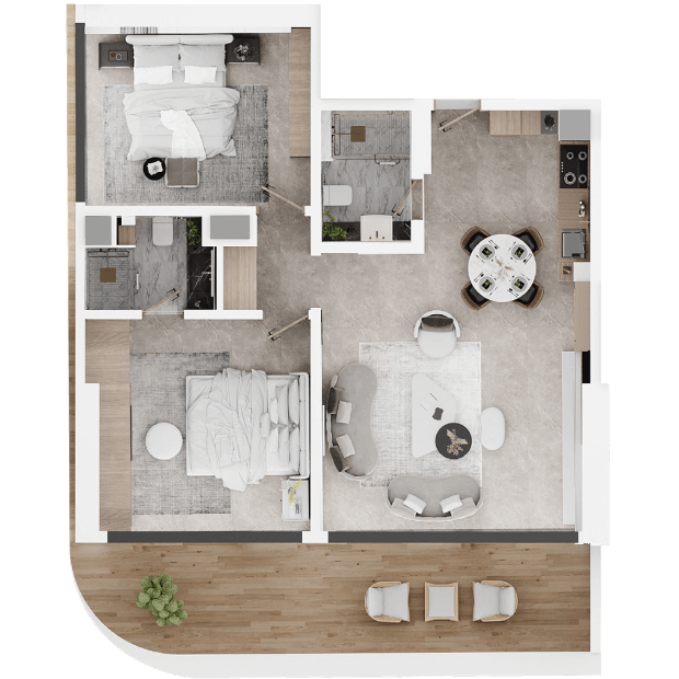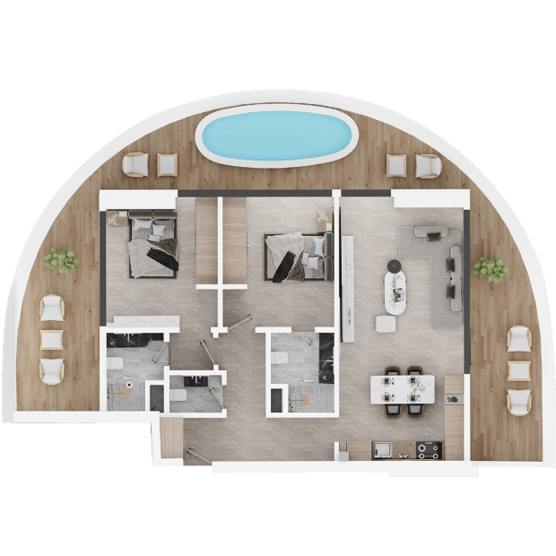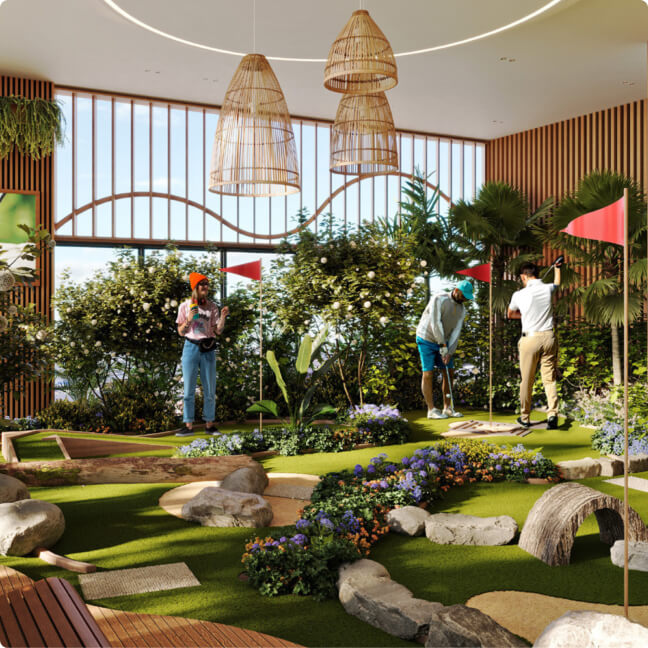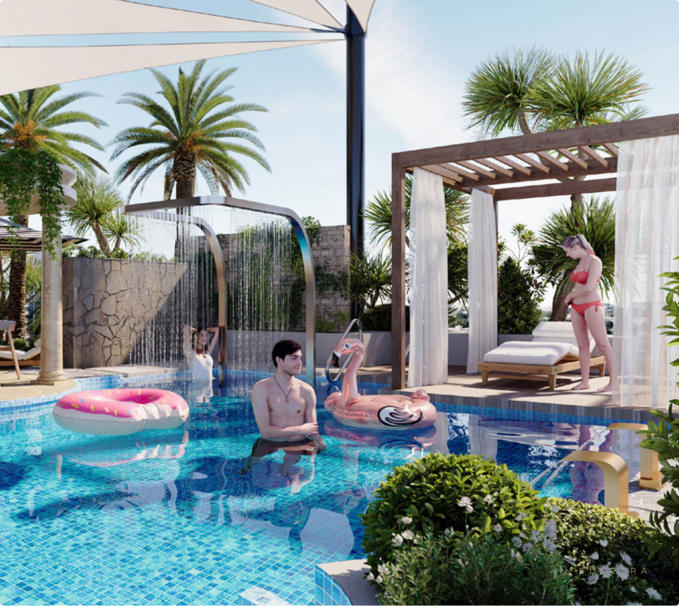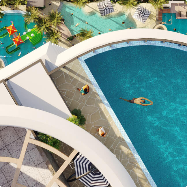 К покупке представлены апартаменты c 1, 2 и 3 спальнями. Жители смогут насладится бассейном с реальным песком, детскими игровыми комнатами, мини-гольфом, тренажерным залом и кинотеатром.