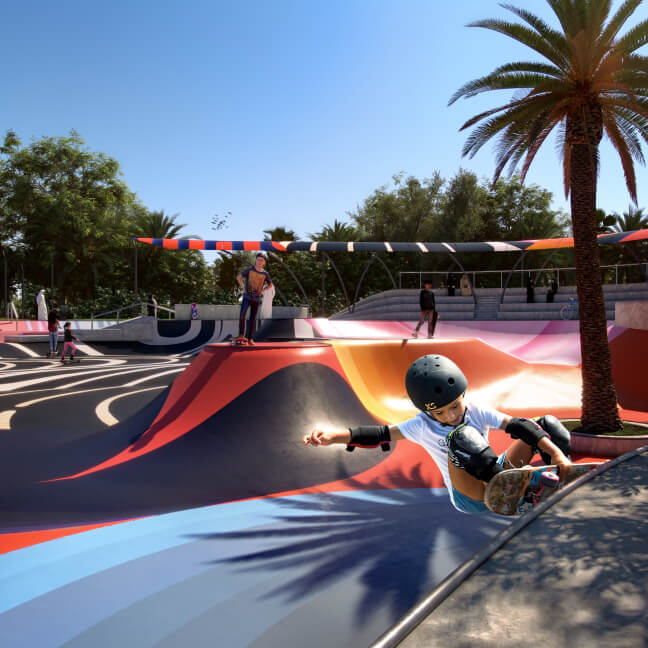 - Площадки для игры в воллейбол, баскетбол, паддл теннис и скейт парк